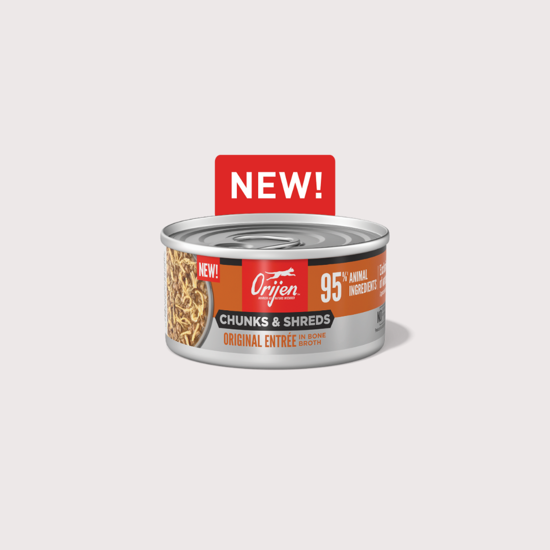 ORIJEN™ 肉塊和肉絲濕貓糧,富含營養豐富的全獵物動物成分,以及真正的肉絲、禽絲或魚絲,為您的愛貓提供全方位滋養!貓是純肉食動物,因此它們需要富含動物成分的飲食才能茁壯成長。這就是為什麼我們的經典主食配方含有高達 95% 的動物成分¹,包括雞肉和鮭魚,為您的愛貓提供它們天生所需的生物學適宜營養。這款貓糧還包含鮮嫩的全獵物成分,例如雞肝,為您的愛貓提供豐富多樣的營養。骨湯有助於補充貓咪的水分,同時增添誘人的風味。每一罐 ORIJEN™ 肉塊和肉絲濕貓糧都富含天然動物成分,質地豐富,口感多樣,讓您的愛貓盡享美味。