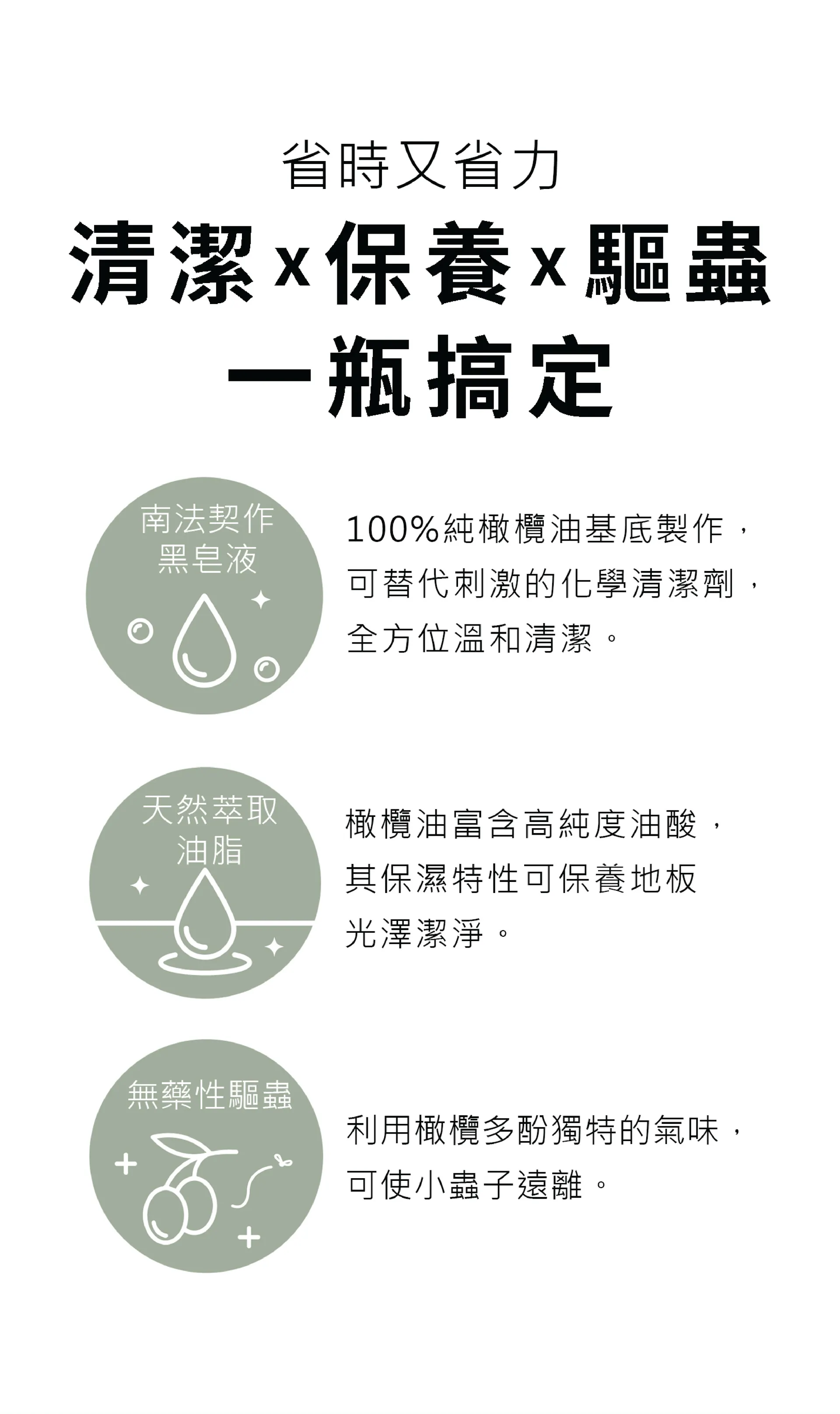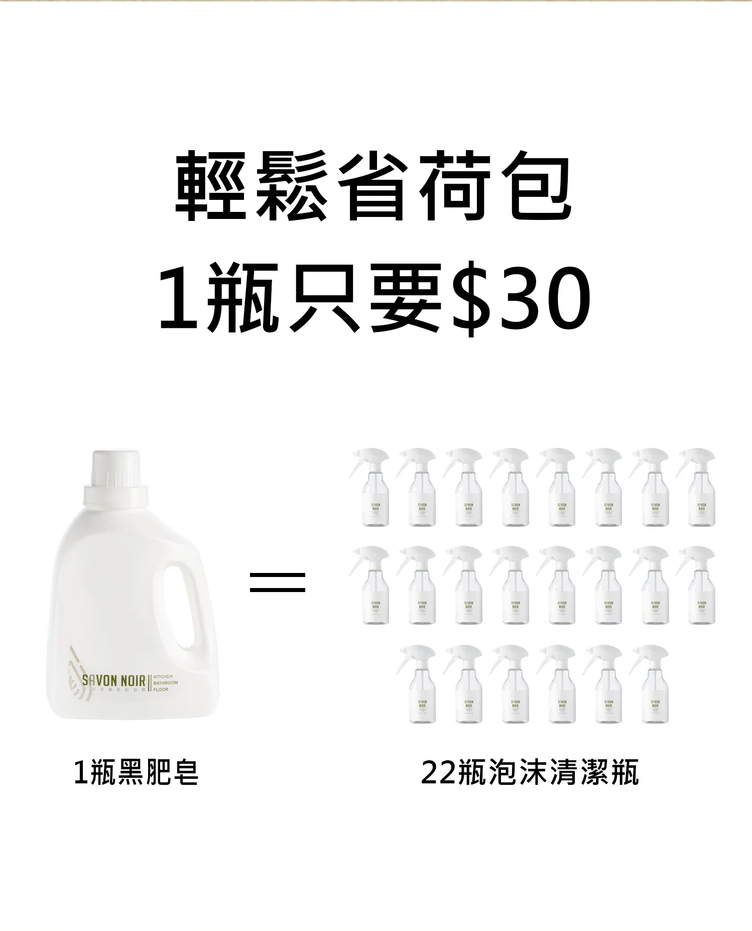 『家事清潔黑肥皂液』簡稱『黑皂液』是源自法國百年的天然濃縮清潔劑,濃縮黑皂液用途非常廣,一瓶可取代家中驅蟲地板清潔劑、廚房去油垢去汙清潔劑、浴廁除水垢清潔用品,成分主要來自高純度橄欖油,環保可生物分解,溫和不傷手,搭配專用泡沫幕斯瓶可迅速吸附瓦斯爐台油汙、高效清潔零死角,居家常見的水垢、皂垢、油垢、寵物尿垢也都能輕鬆除去;並添加養寵家庭也能使用的真正薰衣草精油,蟑螂最怕的味道就是薰衣草香味,用黑肥皂拖地可作為防蟑螂最有效的方法,不擔心化學成分殘留,讓居家清潔省時又省力!