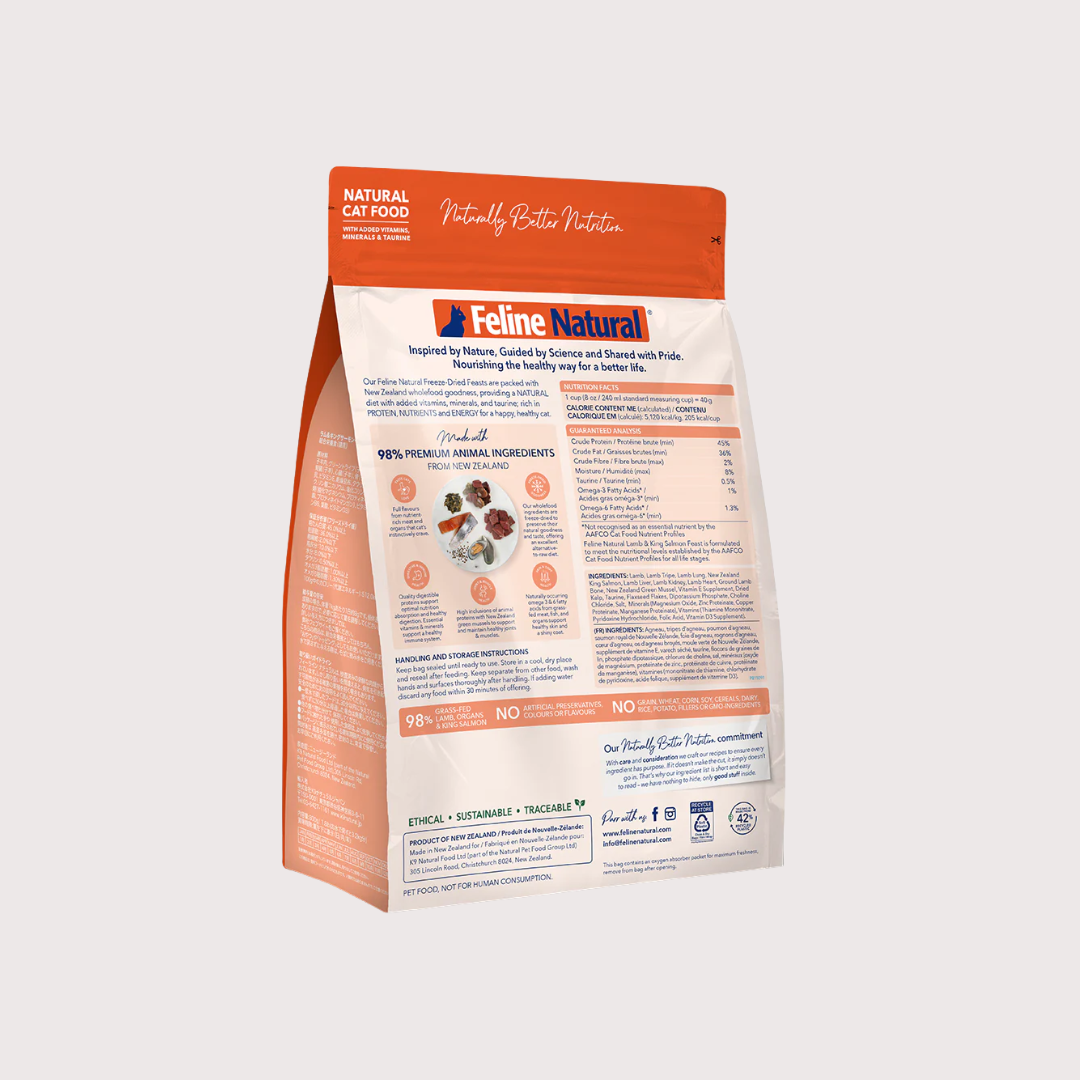 我們的凍乾系列全部選用來自紐西蘭本地食材及精選的維他命和礦物質製成,為您的貓咪提供最佳的營養。紐西蘭自由放牧的草飼羊和可持續捕獲帝王三文魚的配搭,富含蛋白質和Omega 3,有助於貓貓抗發炎,亦有助於毛髮和關節健康。
