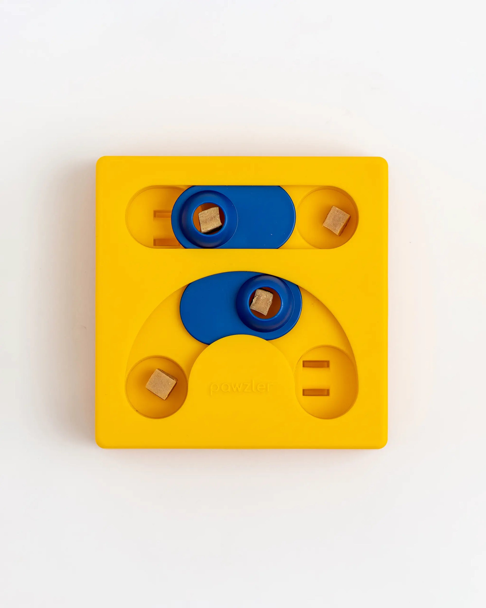 Hint: Place the first two treats in the hiding spots that can be covered with the flat part of the blue slider. Drop the next two treats in the hole on top of the blue slider. Now, the dog needs to push the slider all the way to the other side to uncover the first set of the treats, and to allow the treats in the lid to fall into the hiding space on the other side of the pawzle. Sliders can be pushed with a dog’s nose, tongue, or paw.
