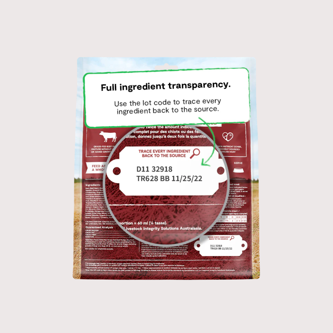 人道飼養牛肉,牛心,牛肝,絞碎牛骨,牛腎,有機紅蘿蔔,有機藍莓,有機南瓜,有機向日葵種子,蒙脫土,有機蔓越莓,非基因改造椰子油,有機菠菜,有機南瓜籽,有機羽衣甘藍,三文魚油,菊苣根,海帶乾,有機蘋果醋,維生素D3補充劑,維生素E補充劑,硫胺素硝酸鹽,葉酸,膽鹼,氨基酸鋅螯合物,氨基酸銅螯合物,硒酵母,薑黃,肉桂,混合生育酚(天然防腐劑)