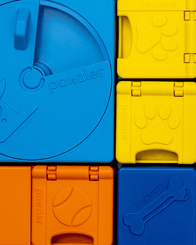 Rainbow set is a dog puzzle that will keep your dog entertained as they use their natural hunting skills to find hidden treats. The set includes treat-hiding mechanisms that require slide pushing, lid lifting, pulling, and lid turning. Each set includes at least one base which holds individual pawzles.