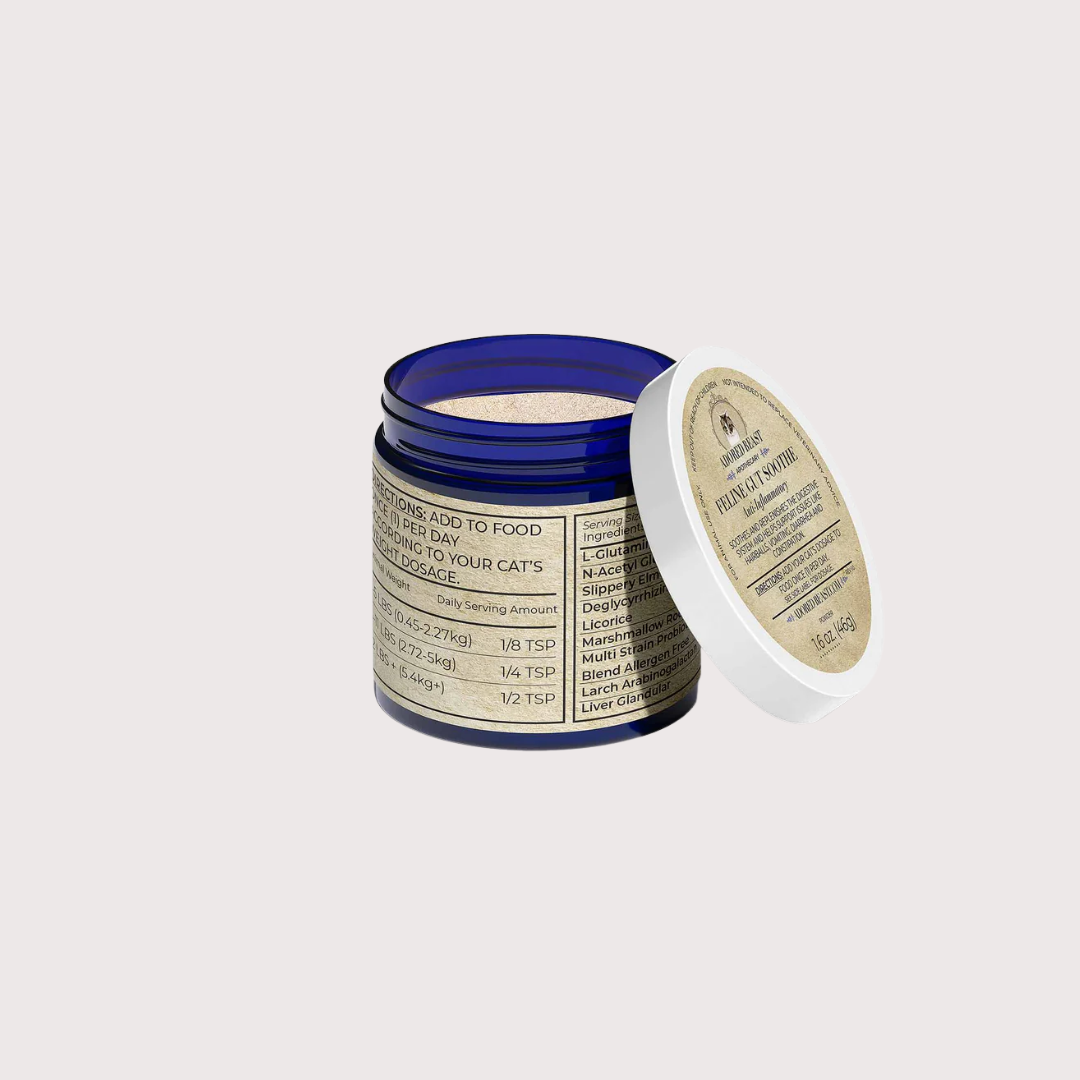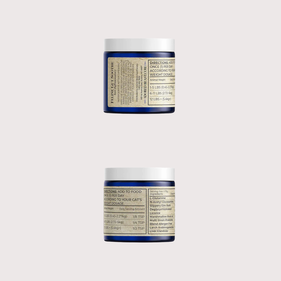 Feline Gut Soothe, a health supplement for cats, is a proprietary blend of pre and probiotics, and select herbs to help maintain a healthy intestinal tract, normal digestive function and maintain a healthy inflammatory response. Feline Gut Soothe also supports respiratory health, and enhances renal function.