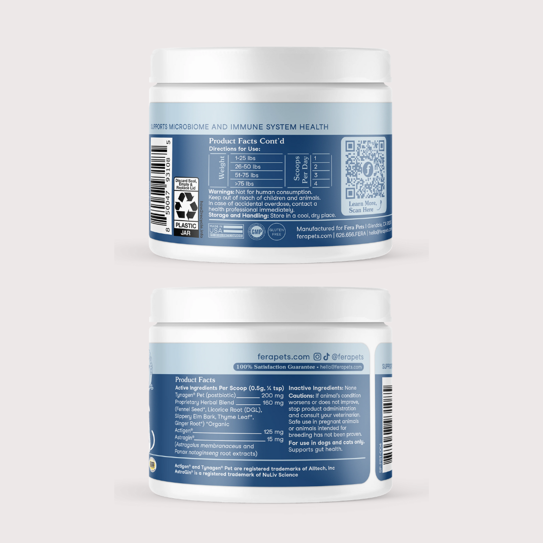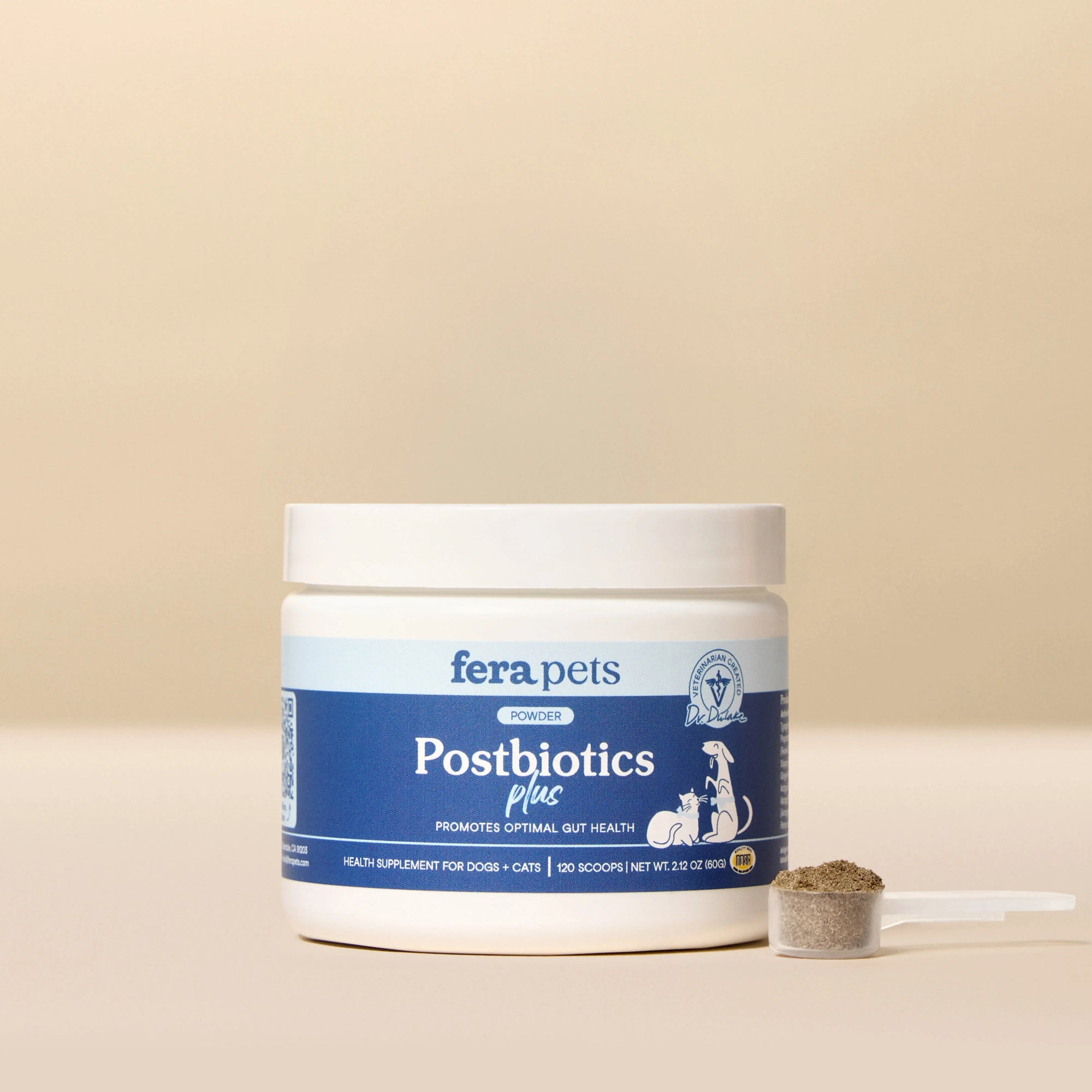 Fera’s Postbiotics Plus for Dogs provides prebiotics, postbiotics and organic botanicals for gentle and effective gut health and immune support.